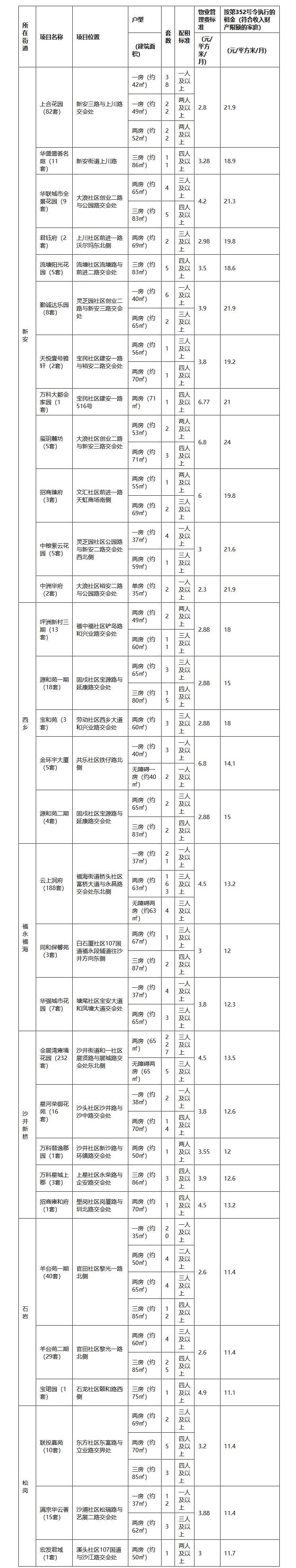 据了解,本批次推出的725套房源地理覆盖新安、西乡、福永、福海、沙井、新桥、松岗、石岩等街道,包含单房、一房、两房、三房等多种户型,可满足不同规模家庭的居住需求。其中会展湾雍境花园项目是此次的“供应大户”,共提供232套两房户型,云上润府项目提供188套房源。此外,新安街道的上合花园、西乡街道的源和苑、石岩街道的羊台苑等项目也提供了数量不等的房源。租金标准根据项目位置、品质等因素有所不同,范围在每平方米每月11.1元至24元之间。